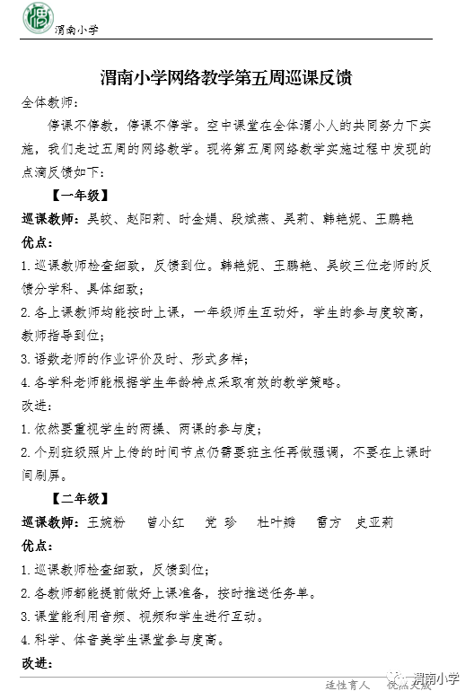 巡課活動是渭南小學對線上教學工作的督促,不但對線上教學活動各個環節全程監督,保障教學覆蓋到每位學生,還能為每個巡課教師提供學習機會,取長補短,有力促進了我校線上教學工作再上一個新的臺階。