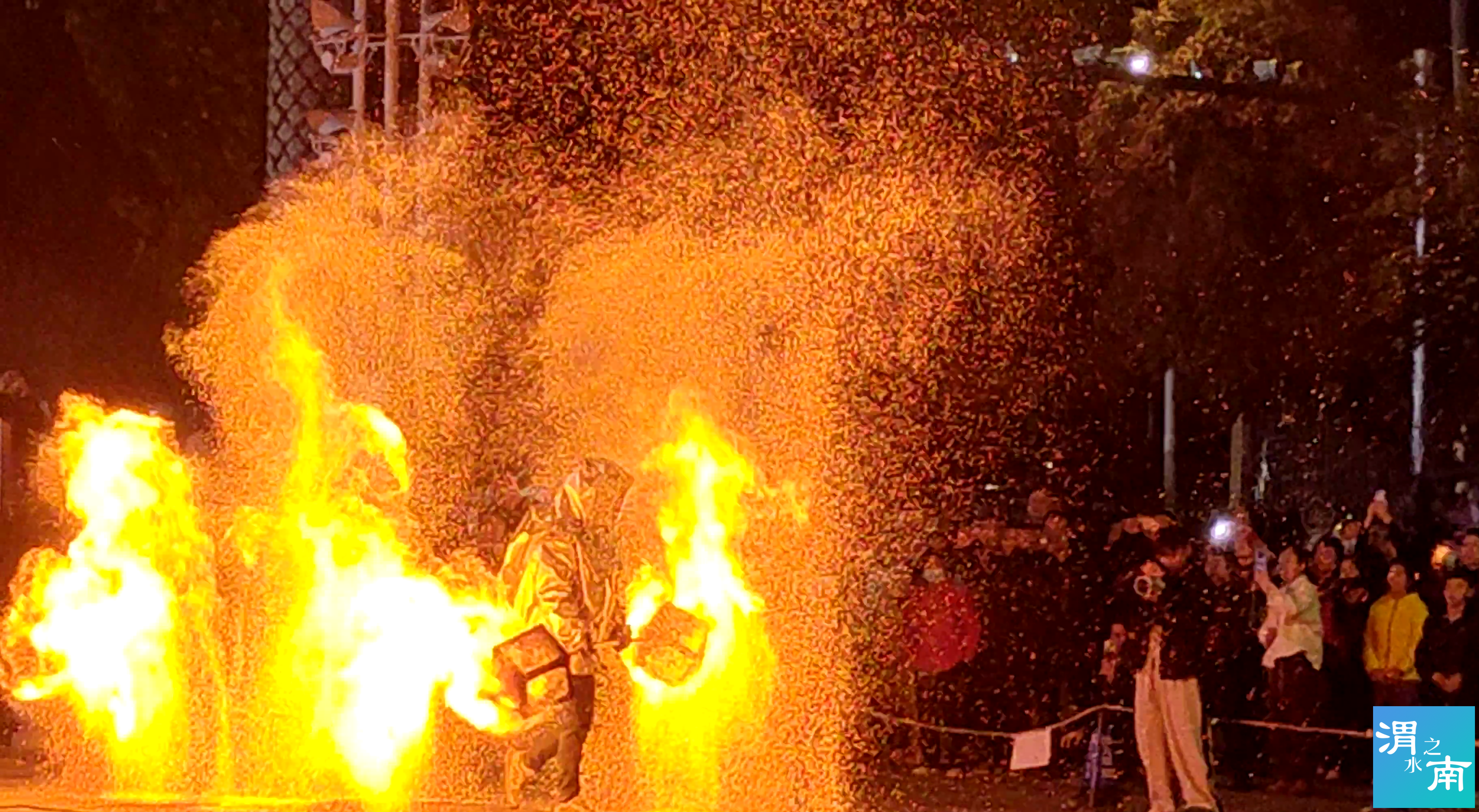 活動現場,噴火表演率先登場,近1米高的火云在空中起落交織,奇幻靈動。隨后,藝人身著專業防火護服,揮舞裝載高溫鐵汁的特制道具,鐵汁飛濺間,幾米高的火雨、火云環繞四周,場面恢弘壯麗。“風火輪”“火焰孔雀開屏”“撒鐵花”等節目接連上演,遙控電子噴火設備噴出的火花喜氣洋洋,“撒鐵花”時紅云罩頂,現場掌聲此起彼伏。