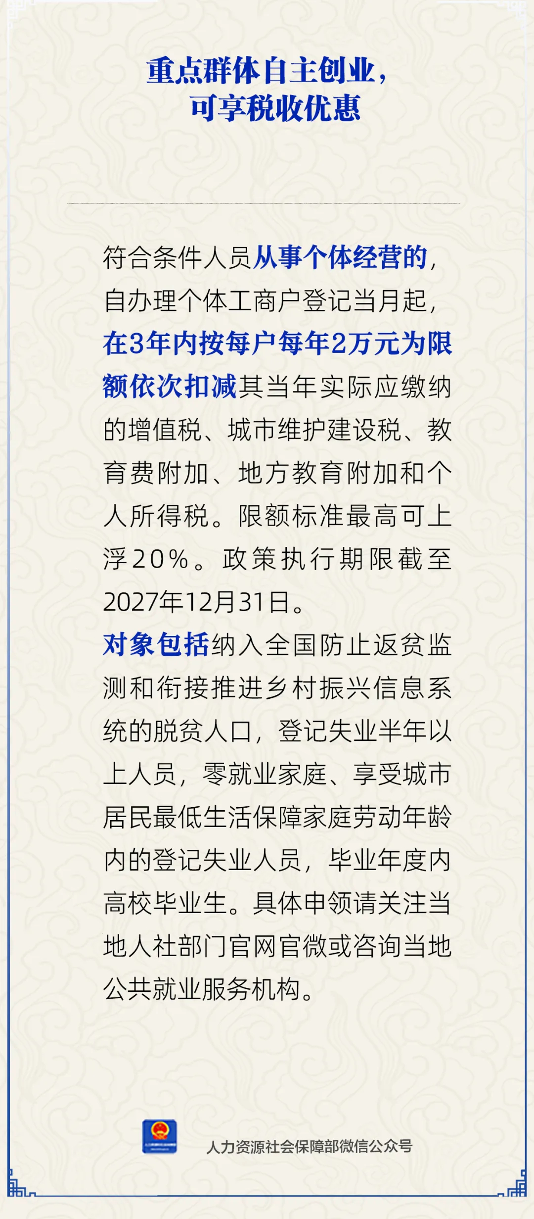 符合條件人員從事個體經營的,自辦理個體工商戶登記當月起,在3年內按每戶每年2萬元為限額依次扣減其當年實際應繳納的增值稅、城市維護建設稅、教育費附加、地方教育附加和個人所得稅。限額標準最高可上浮20%。政策執行期限截至2027年12月31日。
