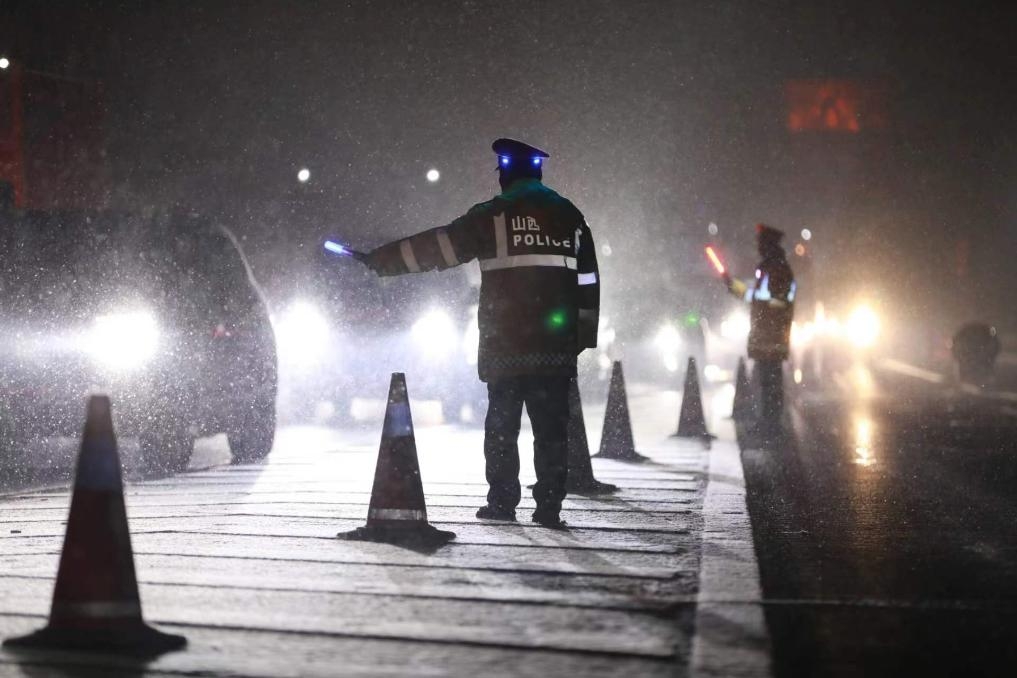 交警在雪天指揮車輛通行(資料圖片)。 新華社發