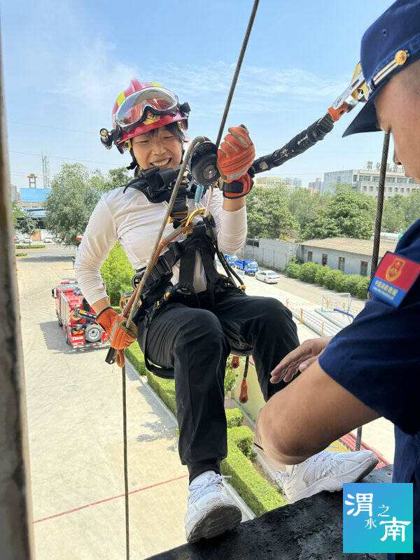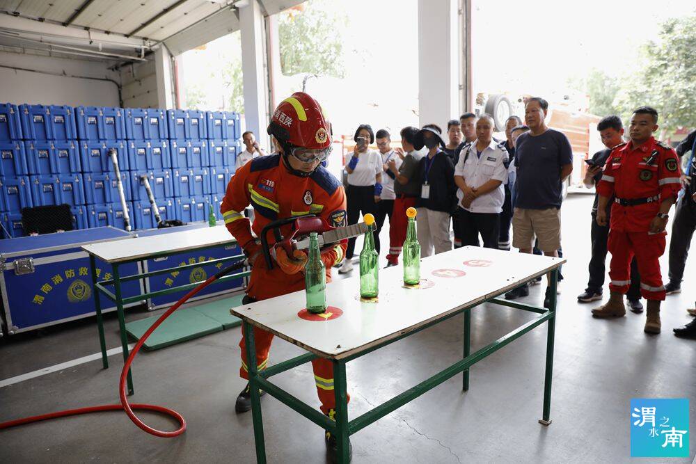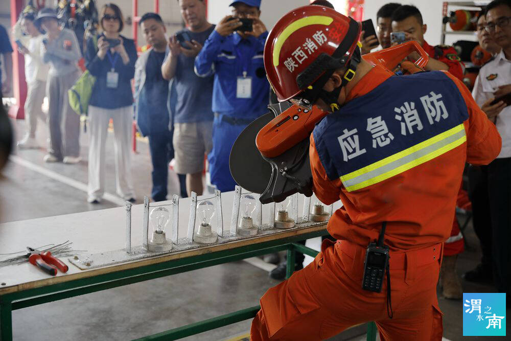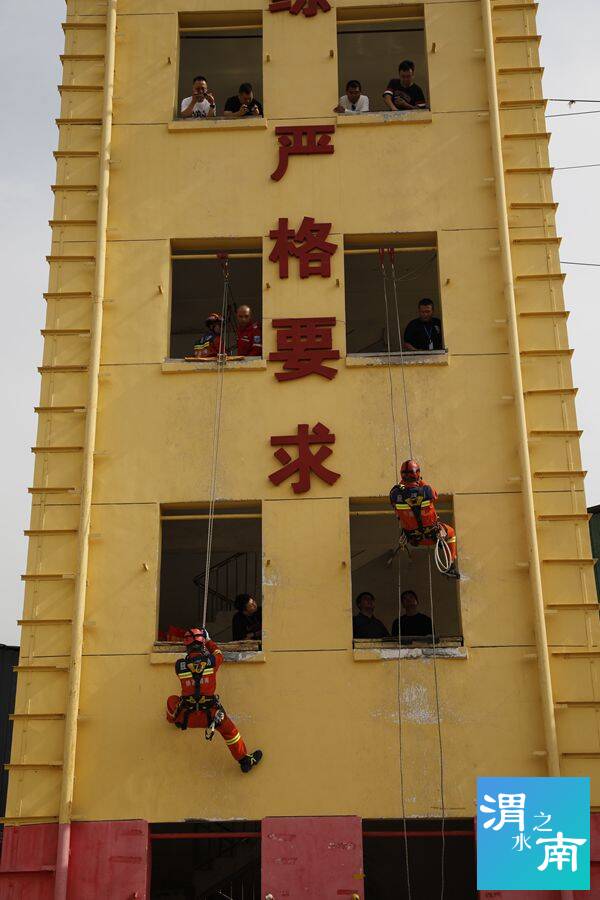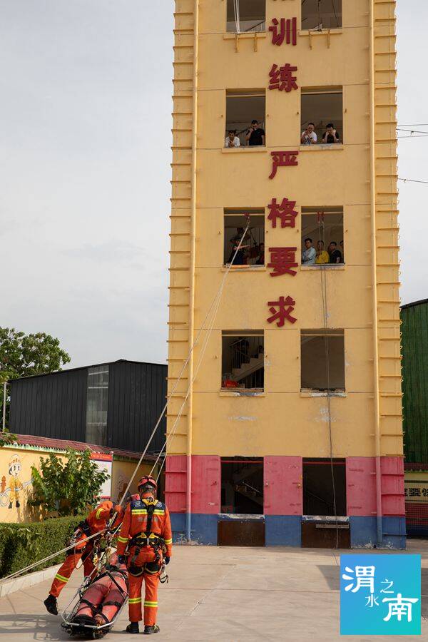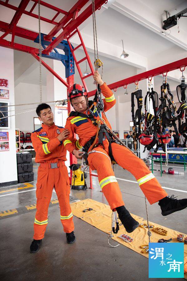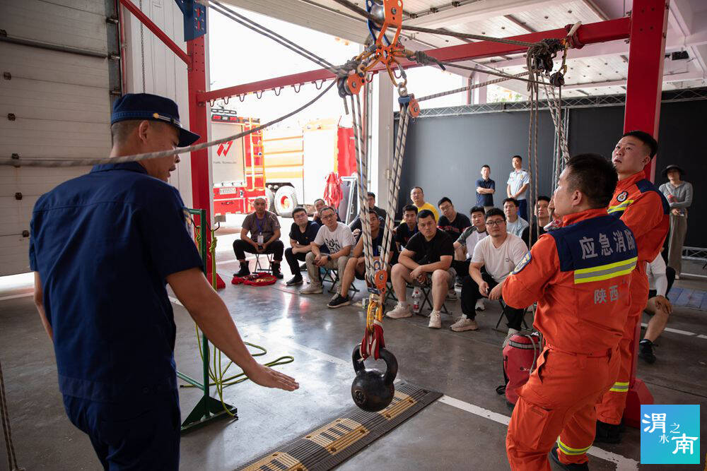 在真煙真火培訓結束后,參訓人員又來到渭南消防支隊特勤站,由教官講解并實地進行地震專業隊裝備器材展示和操作,高空救援科目演示,斜下傷員轉運科目演示。