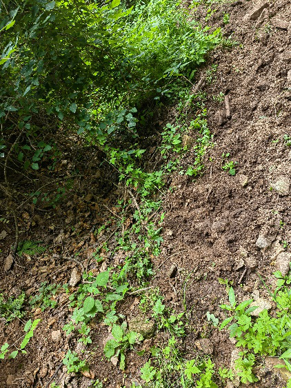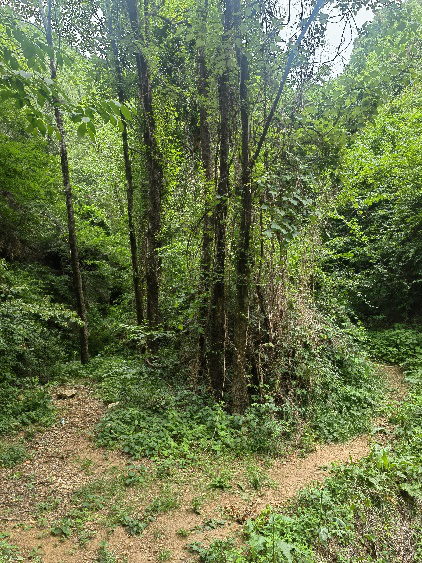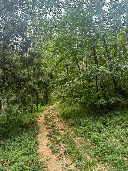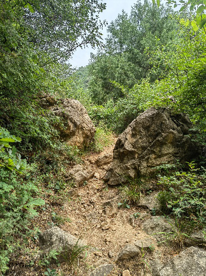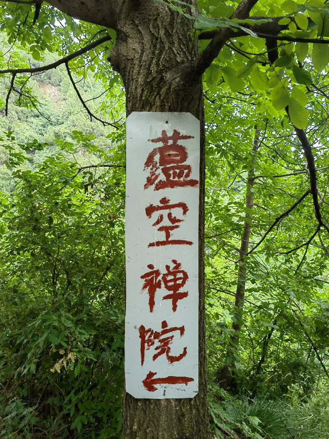 我們沿著蘊(yùn)空禪院的指示牌,在里峪河?xùn)|岸,踏著羊腸小道跋山,開(kāi)始比較平緩,山路也比較安全,大家爬的較快,過(guò)了大石門大家速度放緩,中途還多次休息,過(guò)了小石門更陡,大家休息的次數(shù)更多了,翻過(guò)土地廟,三轉(zhuǎn)兩轉(zhuǎn)就到了原先開(kāi)鐵礦的地方,因?yàn)槭秦毜V,當(dāng)年挖了個(gè)大坑就撩下了,現(xiàn)在被不知名的樹(shù)木遮得密密麻麻,還建了兩個(gè)簡(jiǎn)易廁所,一男一女,為上山人提供方便。