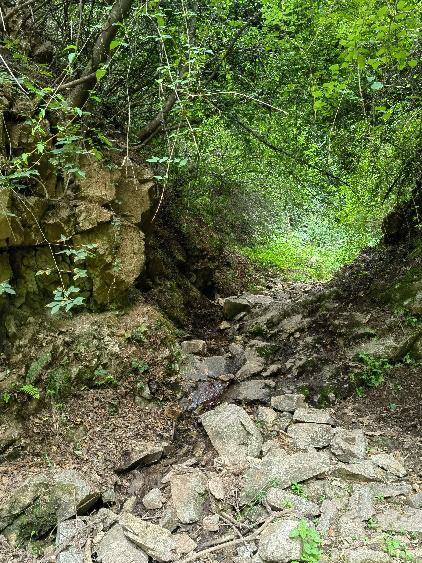 一路上時(shí)不時(shí)有河水出現(xiàn),但小的很,翻過(guò)大石門,上山離開(kāi)了河道,一滴水也看不到了,以前剛下過(guò)雨,我們見(jiàn)過(guò)水流,今天水特別小,可能是下面有空鼓,水從下面流出了山,我們?cè)谙掠蔚哪媳ご迥芸吹剿鳎夷苈?tīng)見(jiàn)流水聲,里峪河南下西拐在渭華起義紀(jì)念館附近流入赤水河。