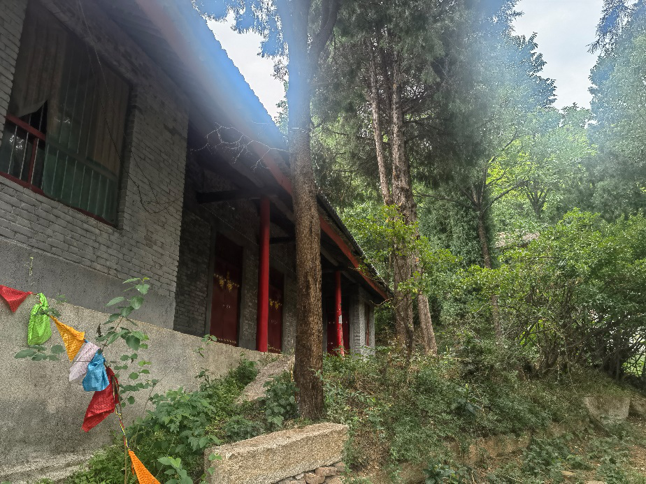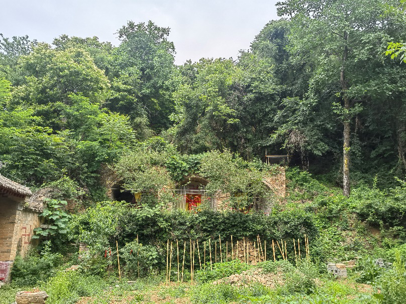 一路上風(fēng)景秀麗,植被繁茂,樹(shù)木林立,高聳入云,林蔭片片,天上白云繚繞,地下野草芳香,一路景觀可圈可點(diǎn),大石門渾然天成,碩大無(wú)比,小石門碧玉靈秀,小巧可人,兩石門都一夫當(dāng)關(guān),萬(wàn)夫莫開(kāi)。半路的土地廟小巧玲瓏,靈氣滿滿,給上山乏人可打氣鼓勁,快到山頂了,我要征服蘊(yùn)空山了。山頂?shù)奶N(yùn)空禪院蔽映在森林之中,大門邊有對(duì)聯(lián)云:慈云行法雨,愿度眾生登彼岸;隱玉蘊(yùn)皆空,行深般若觀自在。教人多行善事,莫問(wèn)前程,放下一切什么都會(huì)有,勸人不要欲望太強(qiáng)烈。進(jìn)門主持在寺院種了西紅柿、黃瓜、豆角等時(shí)令蔬菜,左手是幾間禪房和主持辦公的地方,房后是廚房,往東是大雄寶殿,東邊稍高處(比大雄寶殿高出一米五左右),在山崖上鑿了三孔窯洞,窯洞里都敬有三個(gè)大神,進(jìn)院右手是幾座佛塔,塔下埋的是以前仙逝的主持和一座懸棺墓,寺院形成一個(gè)私密的婆婆院落,開(kāi)有后門在誰(shuí)用。實(shí)際上從橋峪也能到蘊(yùn)空山,就是路長(zhǎng)路難走罷了,我?guī)状味嘉闯尚校胪径怠暮箝T出去往東上到蘊(yùn)空山頂還可以看到橋峪水庫(kù)。