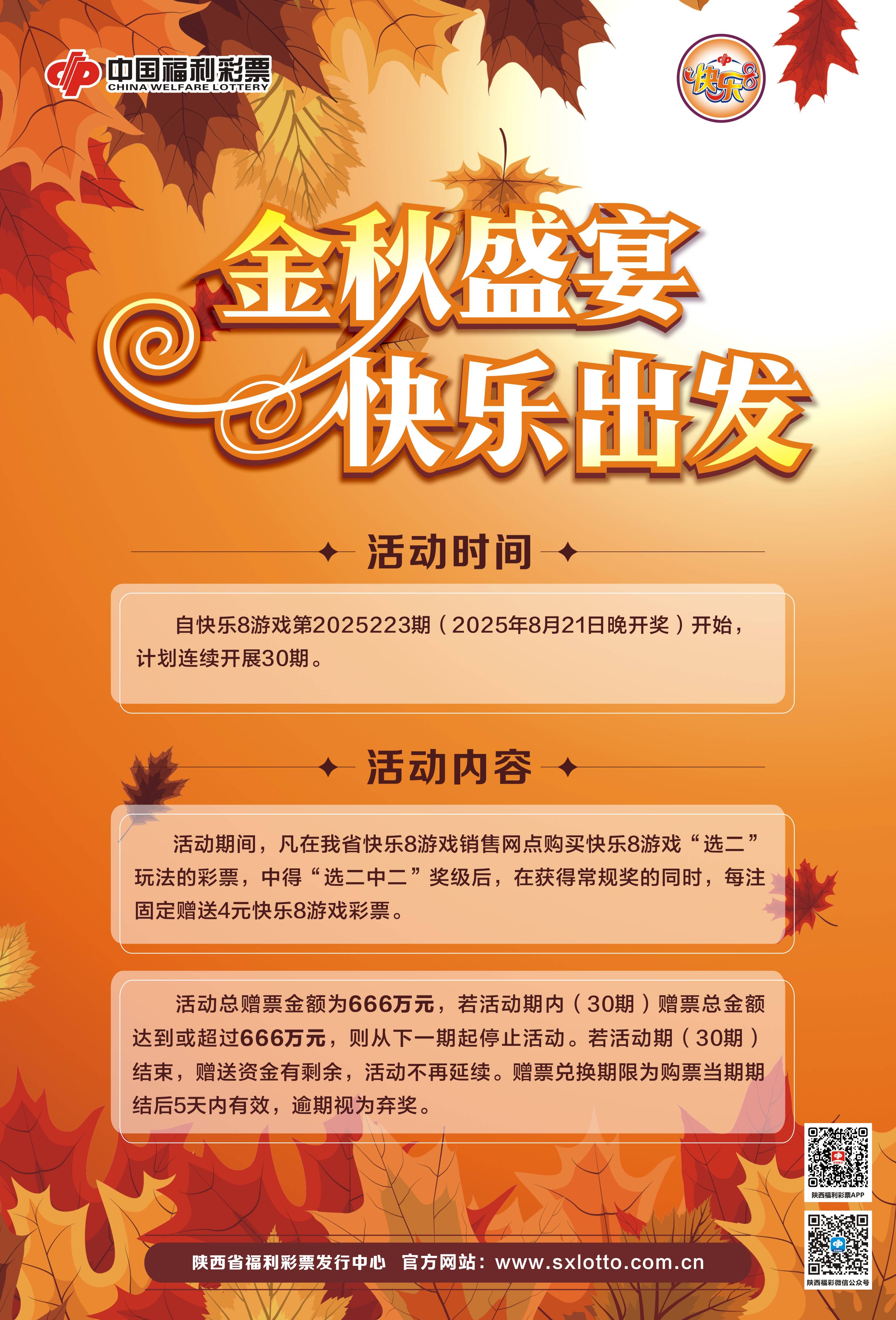 ?8月21日(第2025223期)起,陜西福彩“金秋盛宴 快樂出發”主題營銷活動在全省啟動,渭南福彩“金秋同樂 快樂加倍”活動同步開啟!“選二”玩法單注最高可中27元!