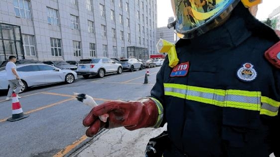 消防員用雞爪模擬人手,將一個圓形鐵片固定在雞爪上。當鐵片碰到電動車電池充電口處時,瞬間火花四濺。