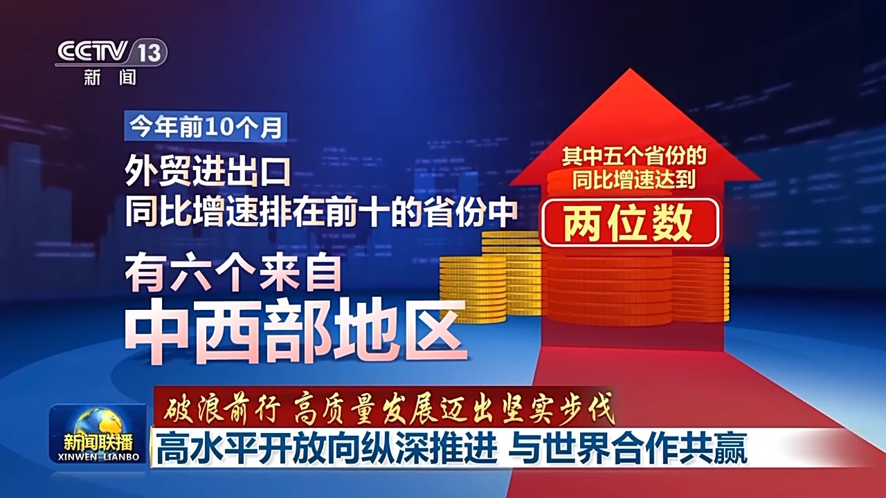 高水平開放,也讓曾經的開放“末梢”變成“前沿”。最新數據顯示,今年前10個月,外貿進出口同比增速排在前十的省份中,有六個來自中西部地區。其中五個省份的同比增速達到兩位數。