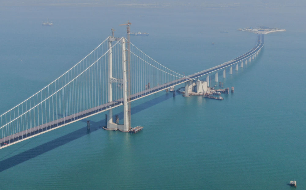 2023年11月28日,粵港澳大灣區超級工程深中通道主線正式貫通,這是深中通道伶仃洋大橋東塔及西人工島(無人機照片)。新華社記者 鄧華 攝