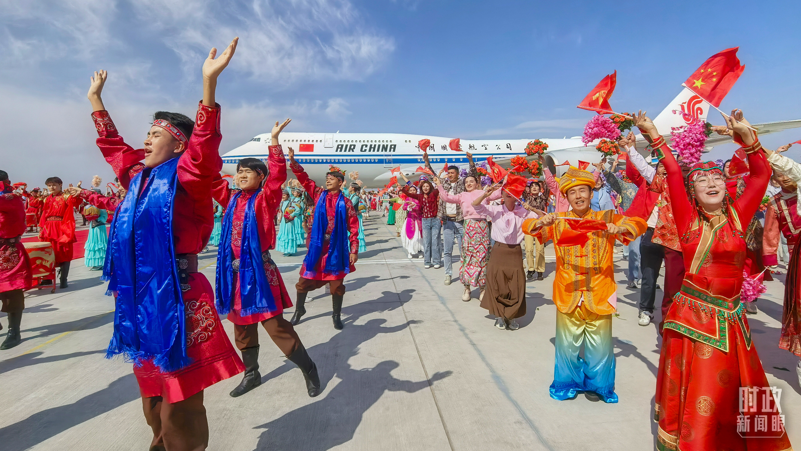23日下午,烏魯木齊天山國際機(jī)場(chǎng)鼓樂喧天。總書記乘坐的專機(jī)在機(jī)場(chǎng)降落,等候在停機(jī)坪的新疆各族各界群眾熱烈歡呼。