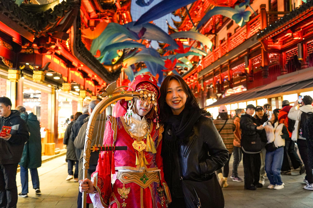 2024年11月30日,來自韓國的游客(右)在上海豫園商城與游戲角色裝扮者合影。新華社發(謝鑫 攝)