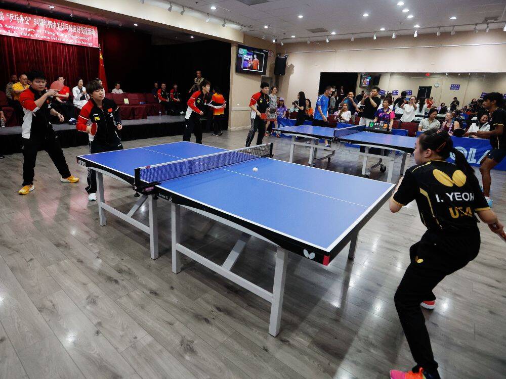 ??這是7月13日在美國內華達州拉斯維加斯拍攝的紀念中美“乒乓外交”54周年暨中美乒乓球友好交流活動現場。新華社發(邱晨攝)