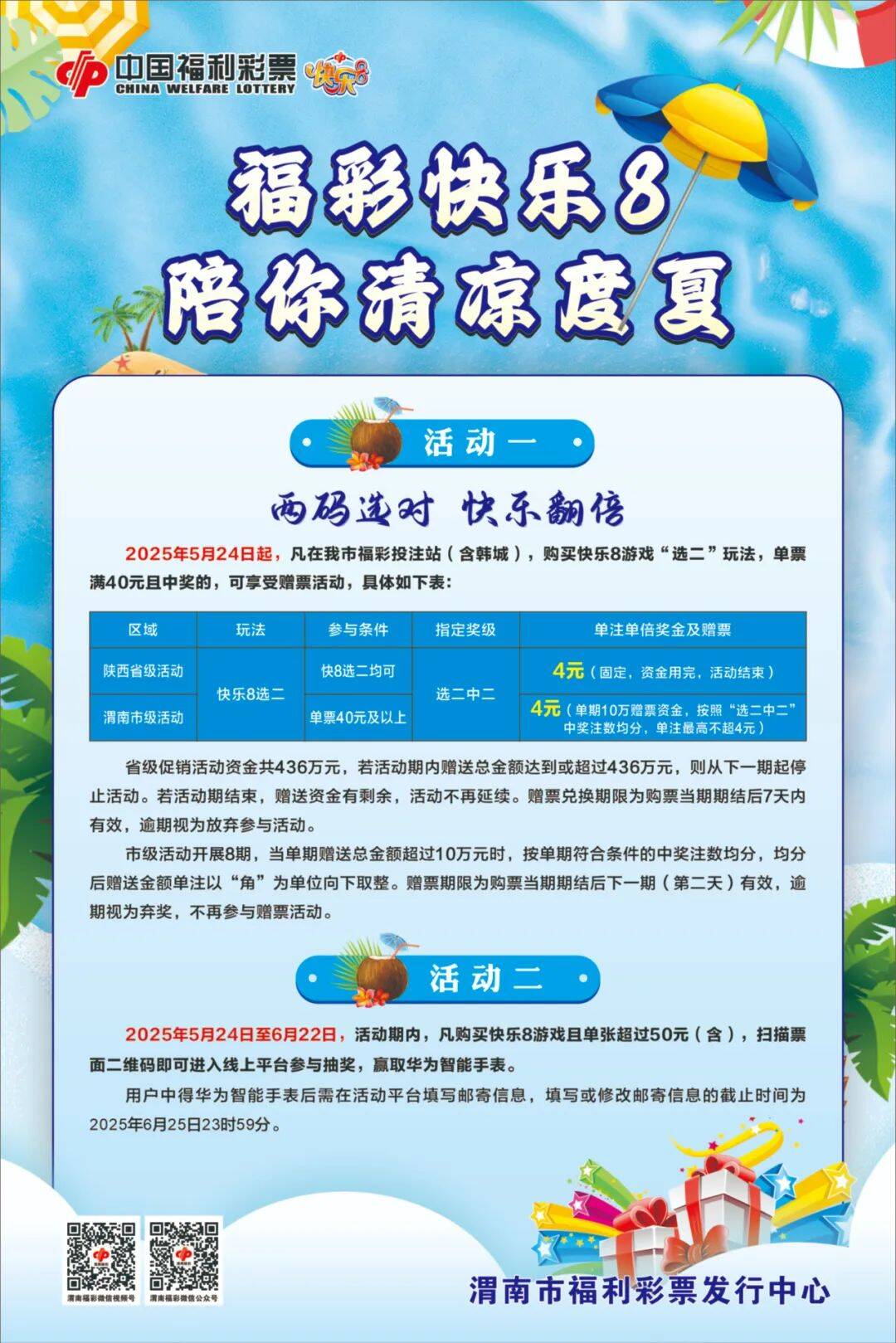 自快樂8游戲第2025134期(5月24日晚開獎)開始,計劃連續開展8期。活動期內,凡在我市(含韓城)任意快樂8游戲銷售網點購買快樂8游戲“選二”玩法,單票滿40元且中得“選二中二”獎級的,可享受贈票活動,單期贈票限定10萬元,單注贈票4元(不含省級贈票),計劃使用資金80萬元,資金使用完畢則活動結束。