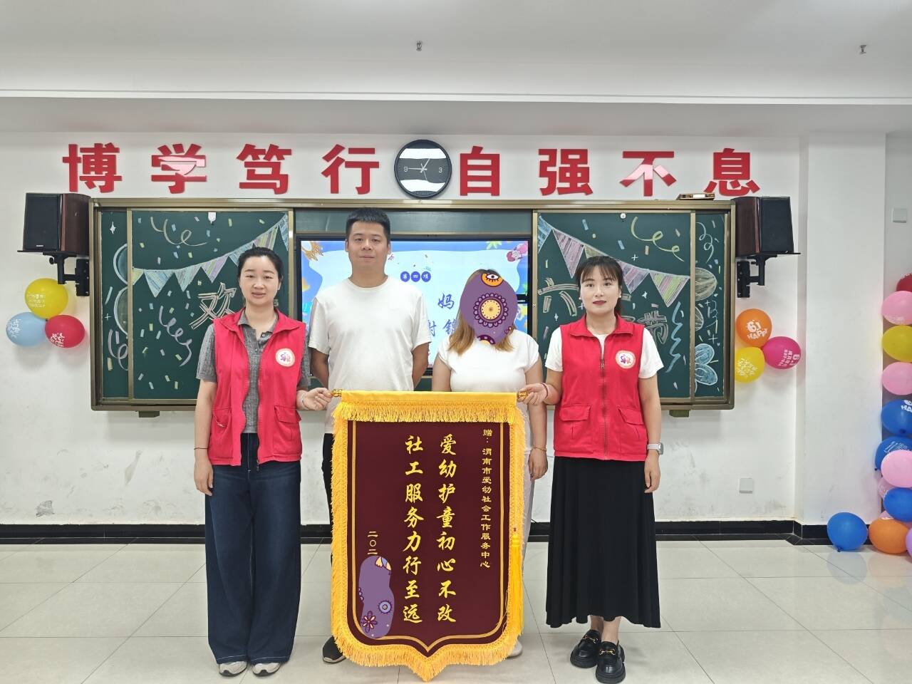 活動中,渭南市救助管理站、市未成年人救助保護中心為11名困境兒童送上了節日禮物,并為他們舉辦集體生日會。工作人員鼓勵他們始終保持樂觀向上的心態,勇敢面對生活中的挑戰,用童真的雙眼發現美好,用稚嫩的雙手創造未來,爭當愛黨愛國、勤奮好學,全面發展的新時代好少年。貼心的節日禮物和生日大蛋糕讓孩子們感受到了來自社會大家庭的關心和溫暖,孩子們用自編的舞蹈《快樂崇拜》和合唱《驕傲少年》等文藝節目回饋了工作人員日常的悉心關愛。活動現場,回歸家庭的孩子家長還為渭南市救助管理站、市未成年人救助保護中心的工作人員送上了錦旗,感謝他們長久以來對孩子無微不至地照顧和關愛。