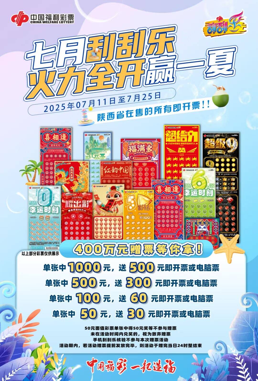 七月刮刮樂,火力全開贏一夏,400萬贈票等你拿!7月11日至7月25日,陜西省在售的所有即開票,單張中1000元,送500元即開票或電腦票;單張中500元,送300元即開票或電腦票;單張中100元,送60元即開票或電腦票;單張中50元,送30元即開票或電腦票。