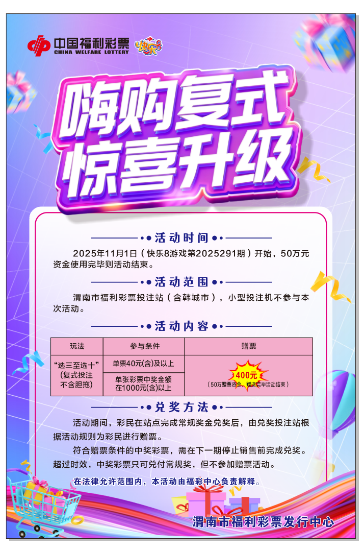 渭南快樂8游戲愛好者的專屬福利來啦!即日起,快樂8游戲“嗨購復(fù)式 驚喜升級”贈票活動在全市火熱進行中,邀您共享快樂8驚喜時刻!