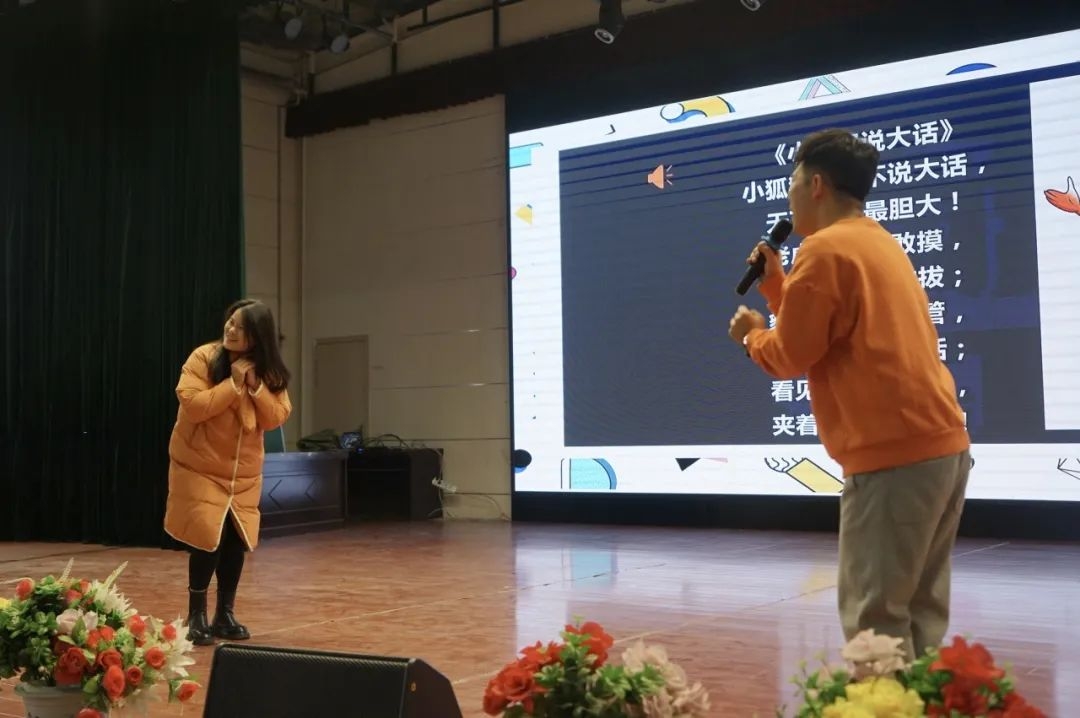 科宇老師聲情并茂地引導(dǎo)學(xué)生們?nèi)绾芜M(jìn)行自我介紹;給學(xué)生們分別講解、展示男女生表演的正確站姿;通過(guò)各種有趣的卡通形象指導(dǎo)學(xué)生進(jìn)行口部操的訓(xùn)練;指導(dǎo)學(xué)生上臺(tái)表演的技巧和流程;還和學(xué)生們一起表演了兒歌《小狐貍說(shuō)大話(huà)》,在表演中引導(dǎo)學(xué)生們尋找聲音語(yǔ)氣的變化等等。