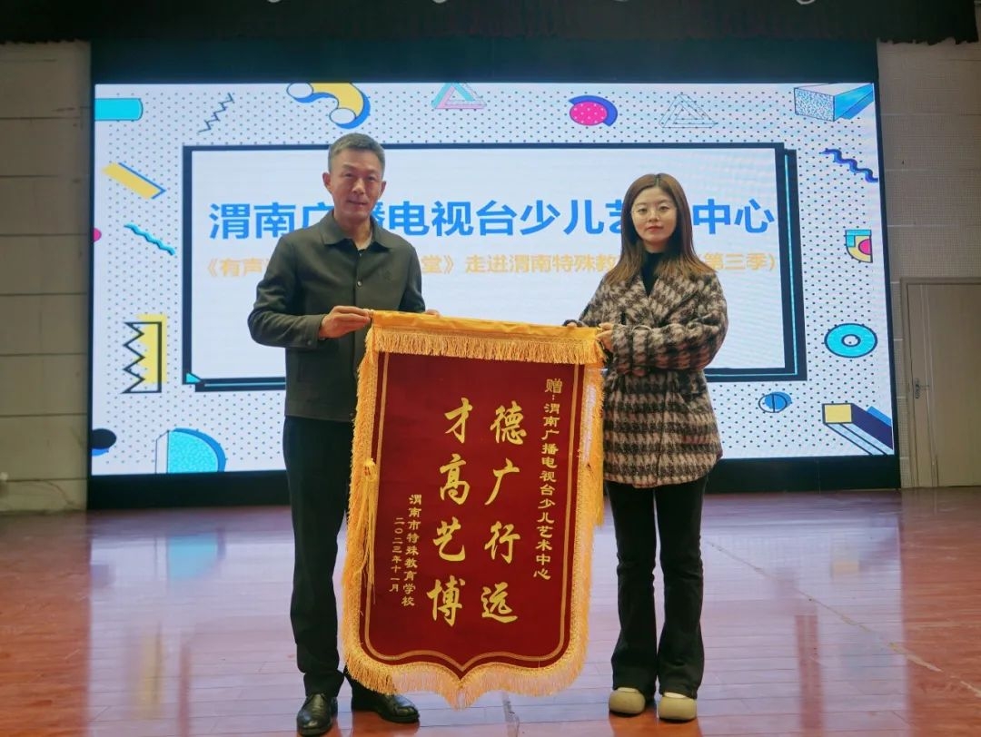 張青峰副校長(zhǎng)為渭南廣播電視臺(tái)少兒藝術(shù)中心回贈(zèng)錦旗。