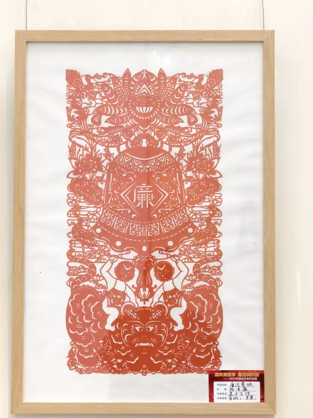 走進(jìn)展覽館,《清廉頌》的莊重、《出淤泥而不染》的高潔,無(wú)不傳遞著扶廉守正的精神境界,還有“庖丁解廉”的油畫作品,栩栩如生的“青蓮”版畫作品,“保泰持盈”的書法作品和“各族人民一家親”的剪紙作品,每一幅都充滿藝術(shù)性和觀賞性。