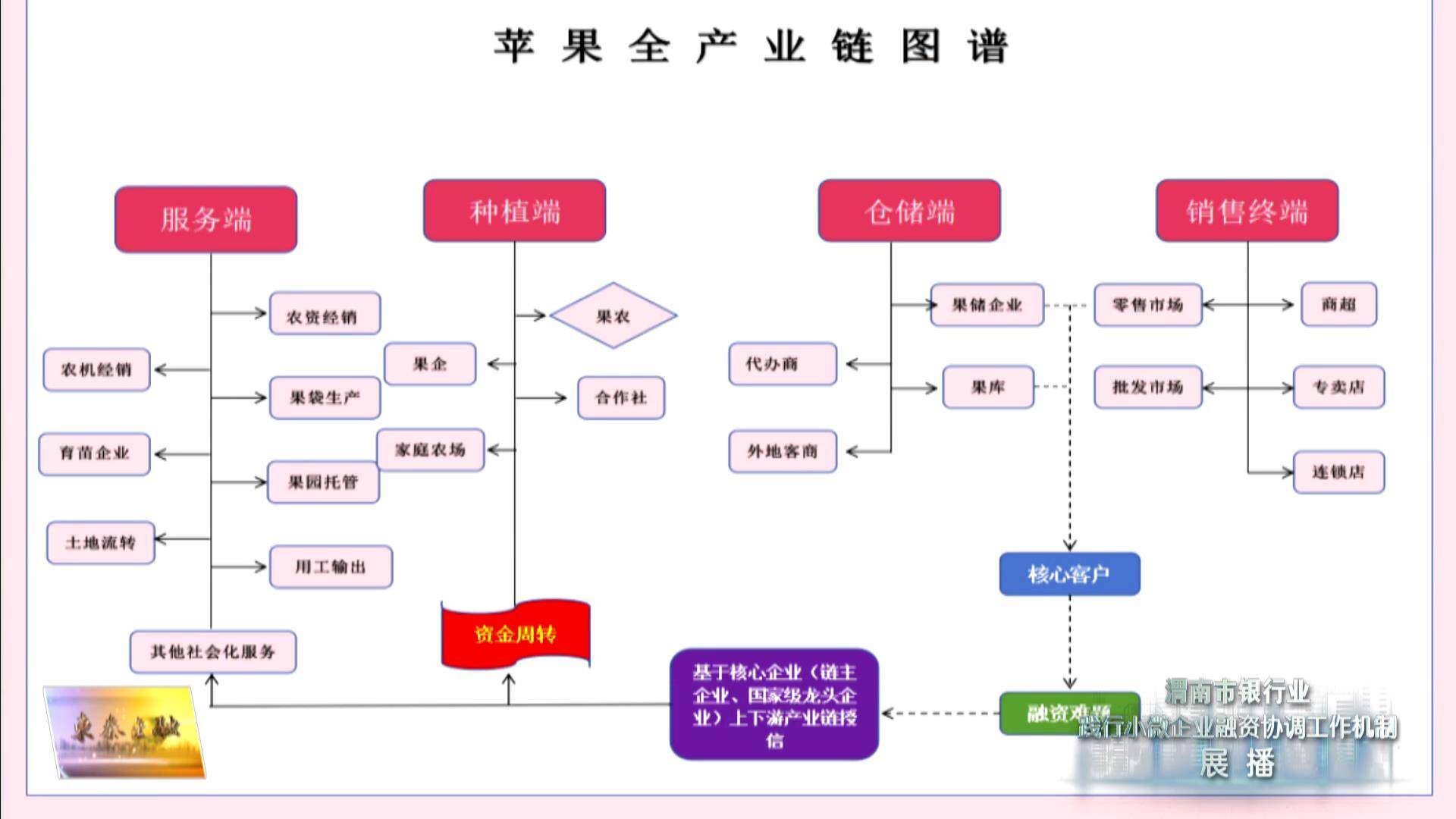在這一體系支撐下,通過精準繪制"蘋果產業鏈金融生態圖譜",系統梳理了從育苗、種植、倉儲到加工、銷售的全流程,摸清了鏈主企業、龍頭企業、專業合作社、家庭農場、種植大戶、個體工商戶等3000戶經營主體的實際情況。