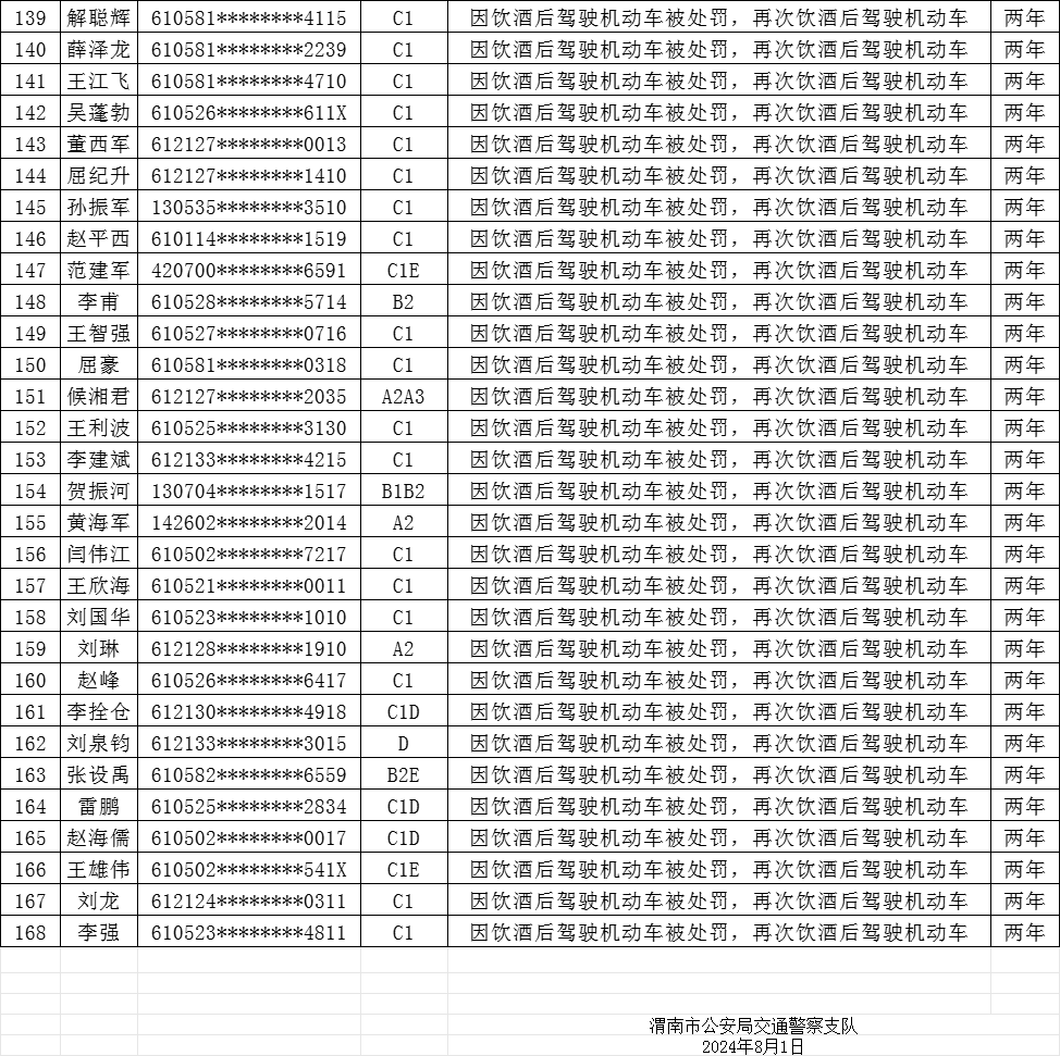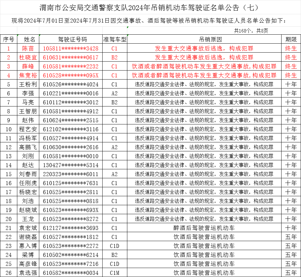 2024年7月1日- 2024年7月31日,渭南全市因交通事故、酒后駕駛等被吊銷(xiāo)機(jī)動(dòng)車(chē)駕駛證人員共計(jì)168人,其中,4人終身禁駕。