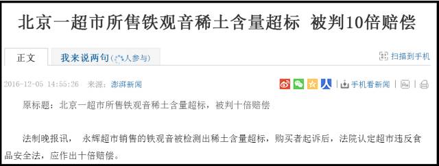 2016年12月,《法制晚報》報道,北京永輝超市銷售的鐵觀音被檢測出稀土含量超標,購買者起訴后,法院認定超市違反食品安全法,應作出十倍賠償。