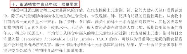 “經反復研究,認為我國居民膳食稀土元素暴露水平很低,稀土元素的健康風險較低,根據聯合國糧農組織食品法典委員會(CAC)食品污染物標準制定原則,建議取消稀土限量指標。”