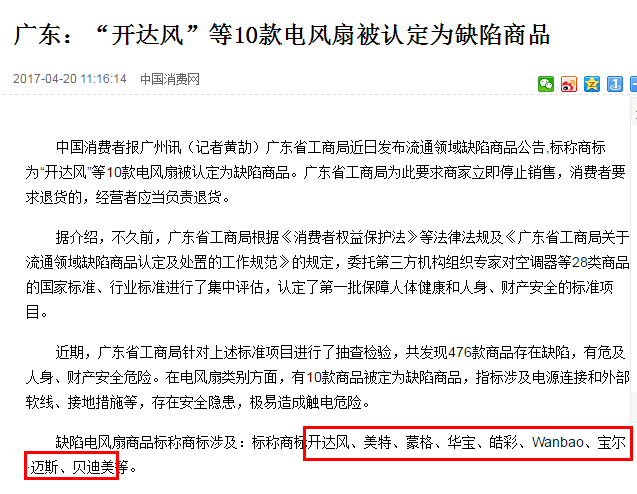 今年4月7日,廣東省工商局公布了該省流通領(lǐng)域10款被認(rèn)定為缺陷商品的電風(fēng)扇,標(biāo)稱(chēng)商標(biāo)涉及開(kāi)達(dá)風(fēng)、美特、蒙格、華寶、皓彩、Wanbao、寶爾·邁斯、貝迪美等,缺陷指標(biāo)主要包括電源連接和外部軟線、接地措施等。