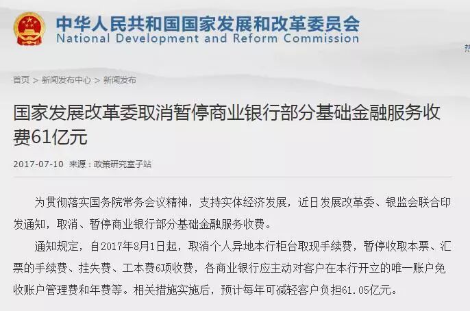 自2017年8月1日起,取消個人異地本行柜臺取現手續費,暫停收取本票、匯票的手續費、掛失費、工本費6項收費,各商業銀行應主動對客戶在本行開立的唯一賬戶免收賬戶管理費和年費等。相關措施實施后,預計每年可減輕客戶負擔61.05億元。