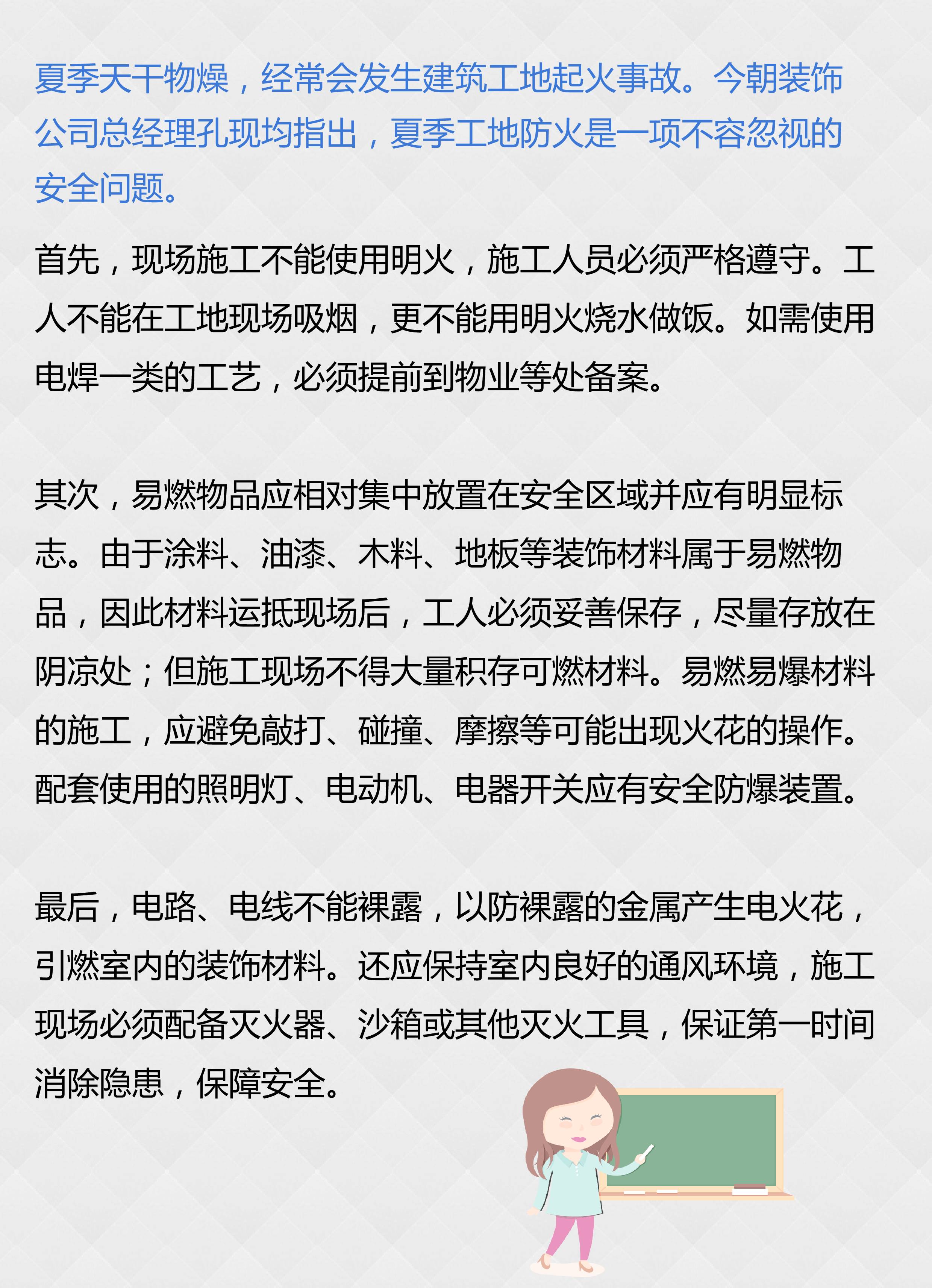 進入7月,天氣越來越熱,高溫酷暑讓很多業主對裝修望而卻步。其實,家裝只要提前做好補水、防曬、防裂、防火等工作,夏季裝修也完全沒問題。具體如何做?下面請家裝行家為您逐一指點。