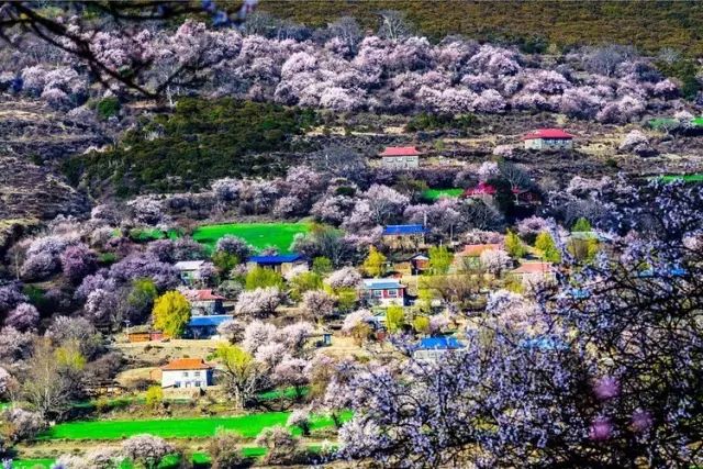 繁花似錦的野桃林,映襯著湛藍天空;潔白雪峰與碧玉般的尼洋河,美不勝收。