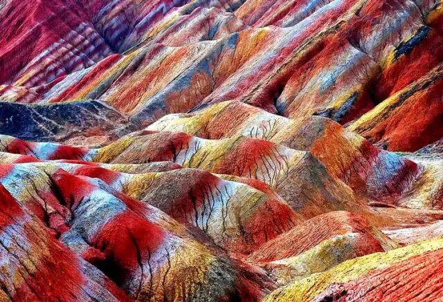 張掖的七彩丹霞地貌群素以層理交錯色彩斑斕稱奇,紅黃白藍,色調有順山勢起伏的波浪狀,在陽光的照射下,像披上了一層紅色的輕紗,熠熠泛光,色彩異常艷麗,讓人驚嘆不已。