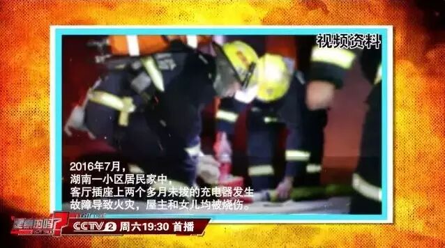 2016年7月,湖南一小區居民家中,客廳插座上兩個多月未拔的充電器發生故障導致火災,屋主和女兒均被燒傷。