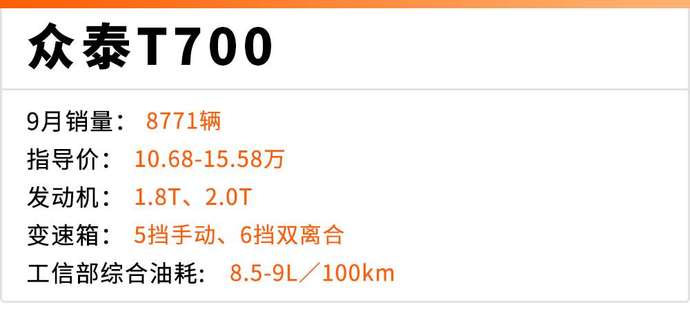 點評:眾泰T700定位于一款中大型SUV車型,外觀足夠威武壯碩。內飾方面雖然有其他豪車的影子,但是總體的做工還是不錯的。作為中大型SUV,T700的座椅布局僅提供5座,沒有7座版本,略顯遺憾。動力方面,搭載1.8T/2.0T兩款渦輪增壓發動機,雖然動力數據一般,但足夠日常使用。不錯的外觀,超大的車身尺寸,不高的售價,它的熱賣也就不奇怪了。當然,眾泰其它中型SUV的銷量也是相當出色,這里僅列舉銷量最高的T700為代表。