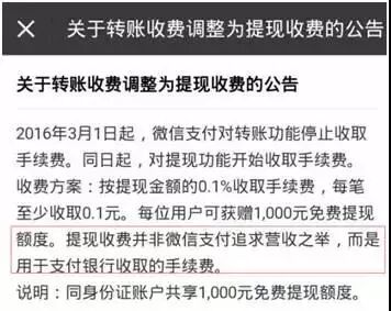 去年2月15日,微信團(tuán)隊(duì)表示從3月1日起轉(zhuǎn)賬功能停止收取手續(xù)費(fèi),但同時(shí)提現(xiàn)功能開始收取手續(xù)費(fèi),每筆收取0.1%的手續(xù)費(fèi),每筆最少收0.1元,每位用戶擁有1000元免費(fèi)提現(xiàn)額度。