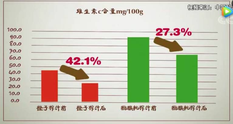 經過實驗我們發現,榨汁前各種水果的維生素C含量遠遠高于榨汁后,榨汁后每百克橙子中的維生素C含量,減少了42.1%。而獼猴桃則減少了27.3%。