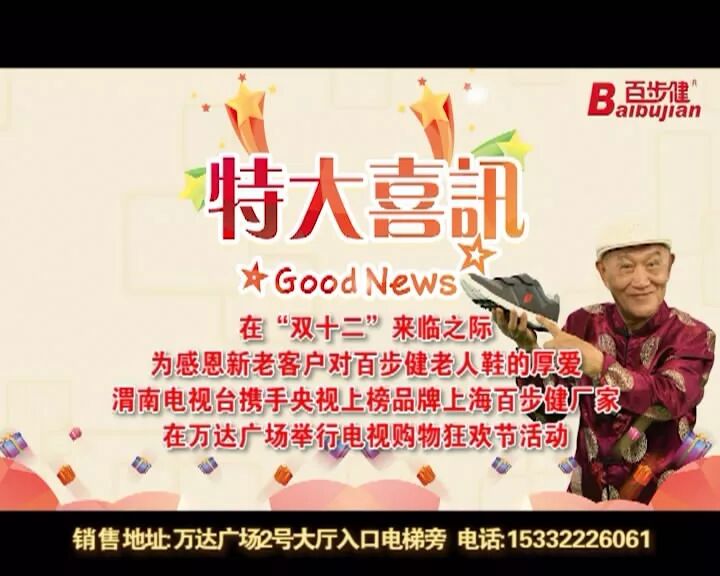 在“雙12”來臨之際,為感謝新老客戶對百步健老人鞋的厚愛,渭南電視臺攜手央視上榜品牌上海百步健廠家在萬達廣場舉行電視購物狂歡節活動,活動期間三重豪禮相送: