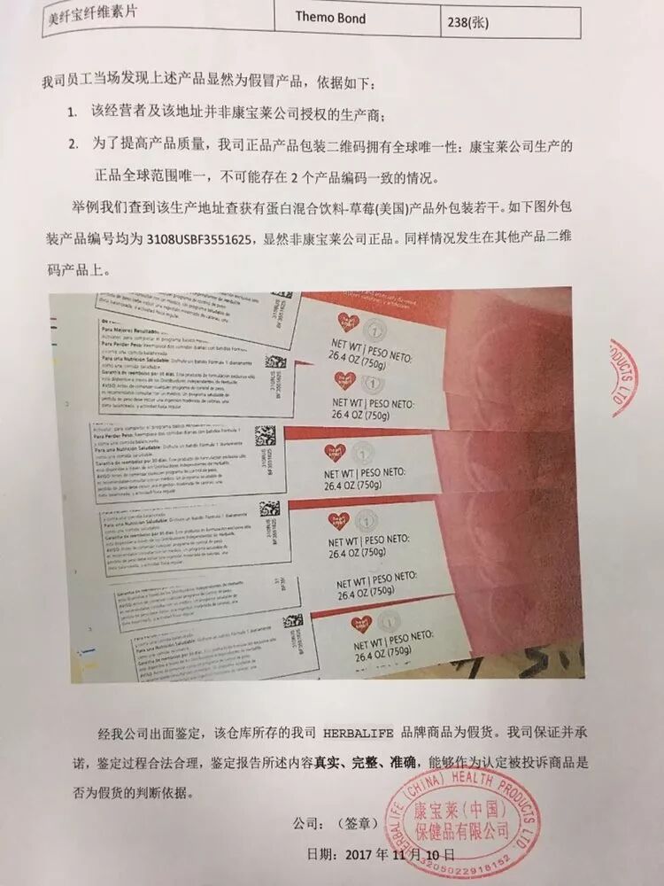 警方提供的美國康寶萊品牌方鑒定書顯示,這些均為假冒產品,均不符合產品標準,長期服用,將會對人體健康產生嚴重危害。