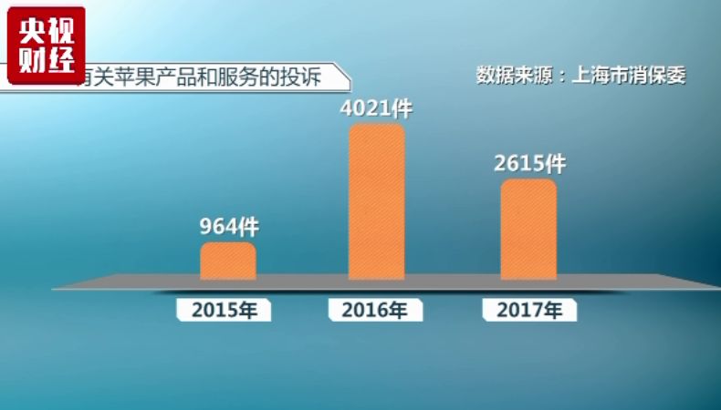 據上海市消保委統計,從2015年到2017年,收到有關蘋果產品和服務的投訴分別為:964件(2015年)、4021件(2016年)和2615件(2017年)。投訴內容涉及電池質量、意外關機、賬號被盜、售后服務等多個方面。