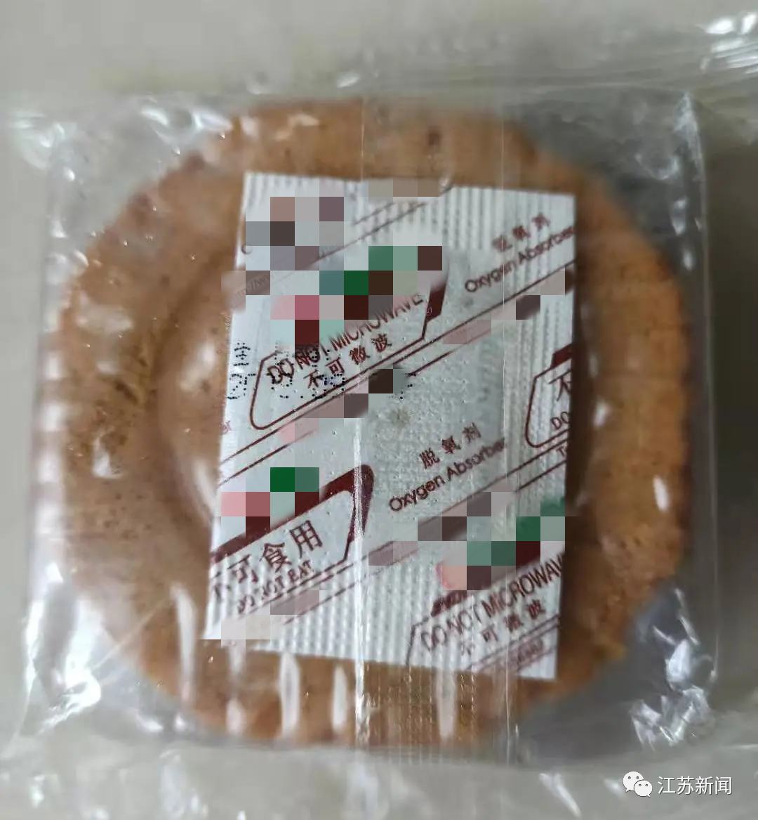 透過塑料包裝可以看到,里面是一個方形的“胚芽白蓮”月餅。從背面看,塑料小包裝內還有一個標注“不可食用”的脫酸素劑。
