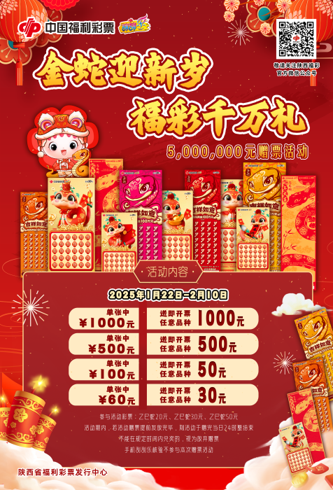 農(nóng)歷新春到來之際,中國福利彩票重磅推出“乙巳蛇”生肖主題即開票;陜西“金蛇迎新歲 福彩千萬禮”生肖票主題回饋活動全省同步震撼開啟,“獎上加獎”500萬贈票等您拿!