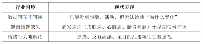 當(dāng)前全球智能寵物項圈設(shè)備普及率提升,但大多數(shù)產(chǎn)品只能提供基礎(chǔ)功能:計步、定位、活動時長分析。缺乏 精準(zhǔn)行為識別、健康風(fēng)險分析、健康趨勢預(yù)測和情緒判斷,導(dǎo)致數(shù)據(jù)被“看見卻無法被使用”。
