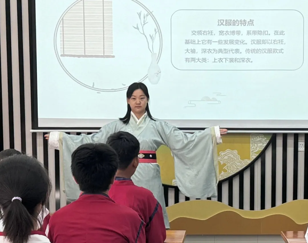 “大家看今天我們穿的漢服漂亮嗎?那我先問問同學們你們知道什么叫漢服呢?”在漢服漢禮體驗環節,社教老師通過向孩子發問互動,給他們介紹了漢服的基本特征、形式演變和文化內涵,還親自示范了漢服的基本禮儀知識,如天揖禮、時揖禮、土揖禮等。小朋友們在輕松愉快的氛圍中,不僅學習了漢服文化,還體驗了傳統禮儀的魅力。