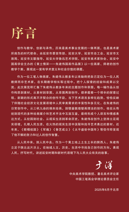 此次展覽不僅是朱建偉的綜合性個展,也展現了魯藝師生的藝術風貌。展品聚焦黃土文化與紅色主題,通過傳統筆墨語言呈現陜北風土與歷史內涵,為觀眾提供近距離感受中國畫創作實踐的機會。