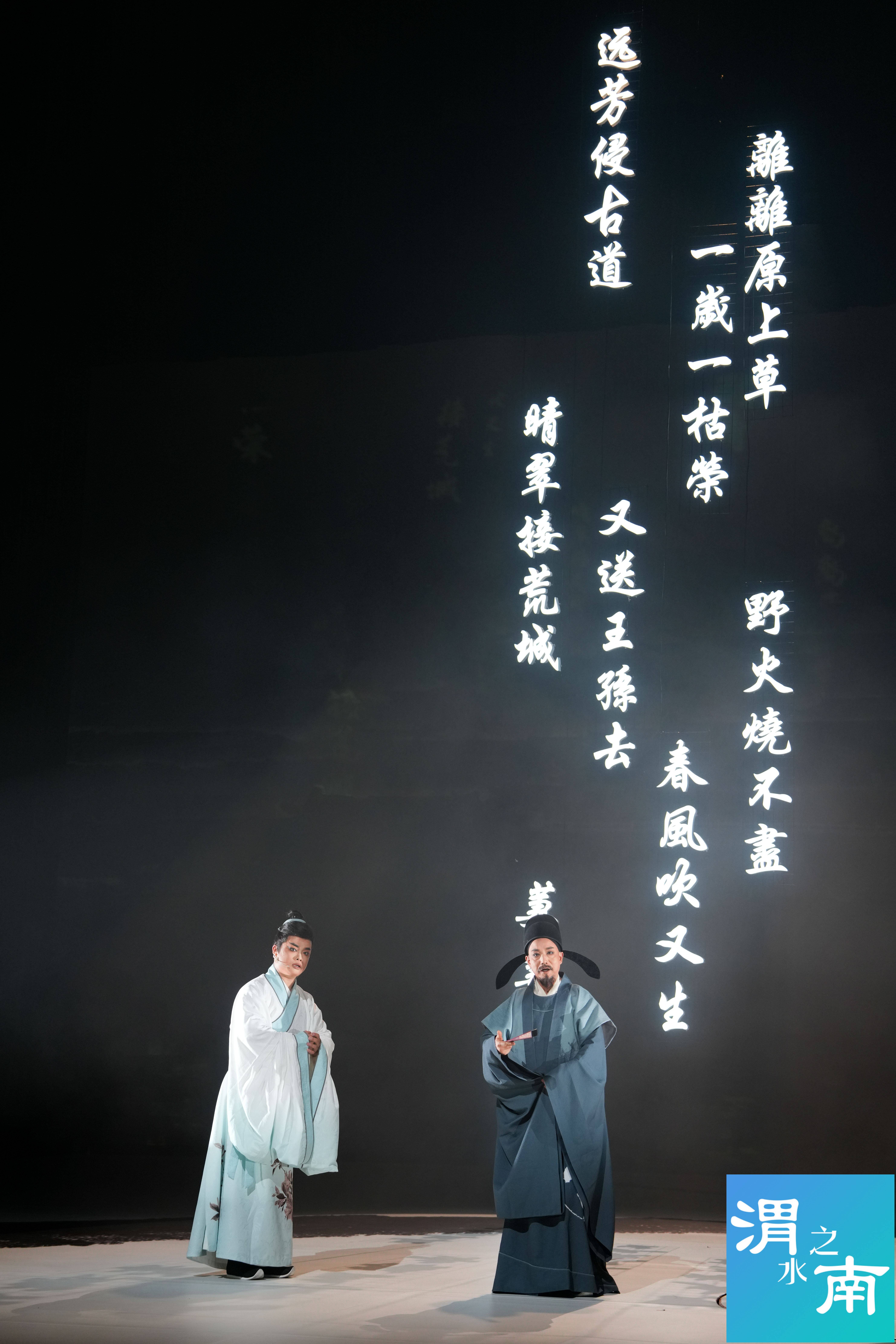 該劇主要選取白居易初入長安時滿懷理想和母親去世后回渭南丁憂守孝這一段真實歷史故事作為敘事主體。其以“用詩化形式進行現(xiàn)實主義表達”為藝術(shù)追求,力求融合古典韻味與現(xiàn)代表達。文本上深入挖掘唐詩的“詩意之美”;語言上巧妙融合陜西方言與詩歌古音;表演上兼具話劇基底與戲曲程式創(chuàng)新;音樂以“秦歌”為主基調(diào),融入唐樂元素,以此展現(xiàn)白居易的人生歷程;舞臺設(shè)計的亮點在于結(jié)合現(xiàn)代燈光舞美與古典元素,讓大唐風(fēng)貌與現(xiàn)實場景相互交織,使敘事更顯立體生動。