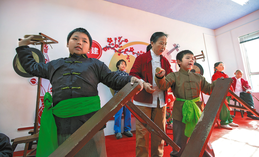 華陰市岳廟街道衛(wèi)峪小學(xué)內(nèi),老腔藝人正在給孩子們授藝(資料照片)。? ?記者 彭一鵬 攝
