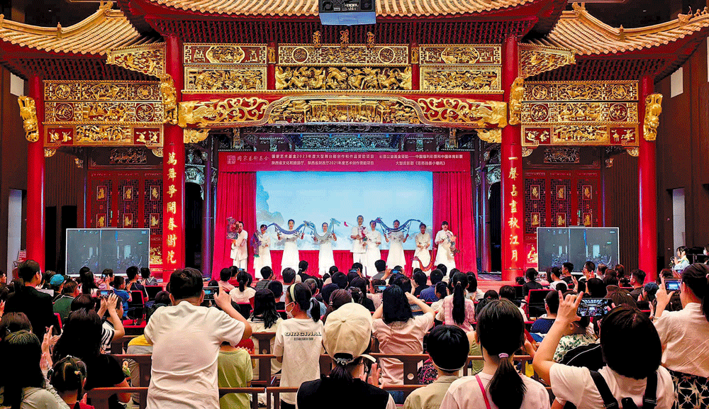 《白居易在渭南》通過(guò)“臨風(fēng)少年”“嵯峨歲月”“躬耕渭上”三幕劇情,細(xì)膩展現(xiàn)了白居易從壯志青年到歸鄉(xiāng)丁憂的人生歷程,將話劇表演與“秦戲”特色融合,用醇厚的關(guān)中方言吟誦,還原了詩(shī)人在渭南的鄉(xiāng)居生活,使?jié)庥舻年P(guān)中風(fēng)土人情躍然臺(tái)上。