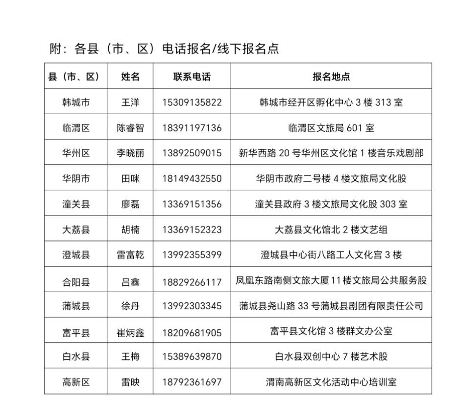 3、線下報名:參賽人員到所屬區域文旅部門指定地點現場報名(見附件:各縣(市、區)電話報名/線下報名點)。
