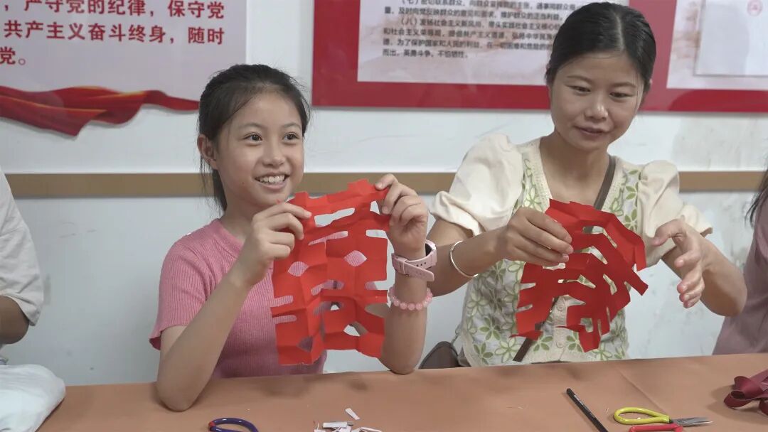 實操環節中,居民們在曹老師手把手指導下,從基礎折紙練起,再小心翼翼下剪創作。隨著剪刀起落,原本普通的紅紙,慢慢變成了寓意“雙喜臨門”的紅雙喜、再現“牛郎織女鵲橋相會”的經典場景等充滿七夕元素的作品。“這是我第一次剪傳統紋樣,成品拿在手里特別有成就感!比起手機里的文字祝福,這親手剪的剪紙更有溫度,也更有節日味兒!”剛完成作品的李阿姨舉著剪紙,臉上滿是喜悅。這兩場活動正值暑假,有多名小學生也參與進來,活動中表現出了濃厚的興趣和很強的動手能力。