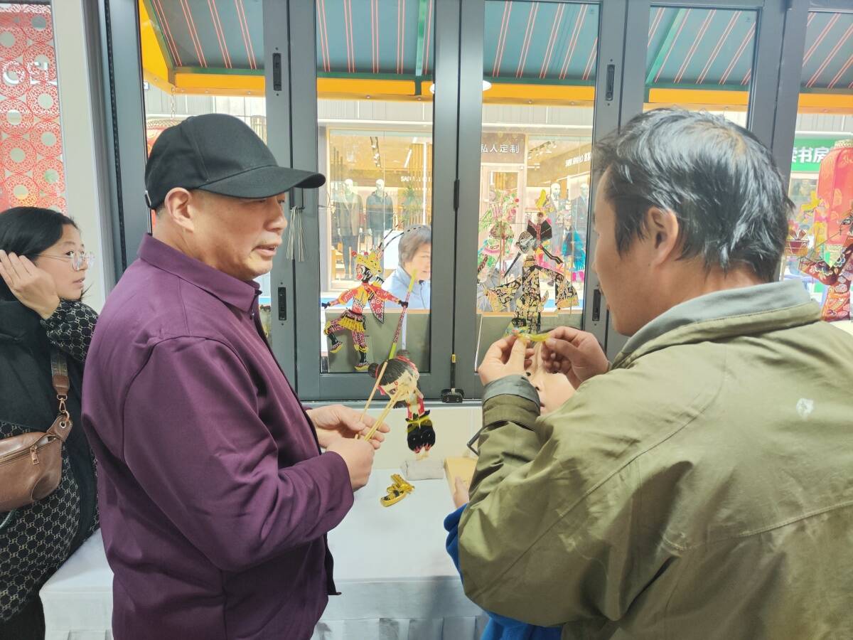 非遺展品融入大量當代元素,哪吒造型皮影、卡通唐僧師徒剪紙、金屬外殼草編首飾、小巧黑陶擺件等創新作品備受青睞,河南游客現場向華州趙氏皮影傳承人學習刻畫工藝。北側店面則供應美食、玉器等商品,滿足市民多樣化消費需求。