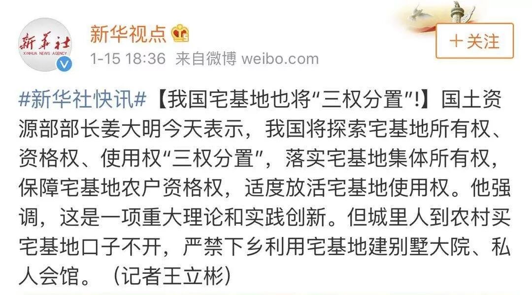 國土資源部部長姜大明表示,我國將探索宅基地所有權、資格權、使用權“三權分置”,落實宅基地集體所有權,保障宅基地農戶資格權,適度放活宅基地使用權。他強調,這是一項重大理論和實踐創新。但城里人到農村買宅基地口子不開,嚴禁下鄉利用宅基地建別墅大院、私人會館。